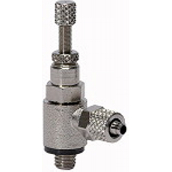 Drosselventil, beidseitige Drosselung (»B«) Schnellverschr. Schlauch 6/4, M5, PN max. 10 bar, Temp. 0 °C bis 70 °C, MS vern.. Zur beidseitigen Regulierung der Kolbengeschwindigkeit von Zylindern und von Durchflussmengen. Ausführung in Hohlschraubenbauweise mit Ringstück zum direkten Anbau. Der eingestellte Volumenstrom kann bei der Ausführung mit Rändelschraube mit der Sechskant-Mutter gekontert und somit fest eingestellt werden.