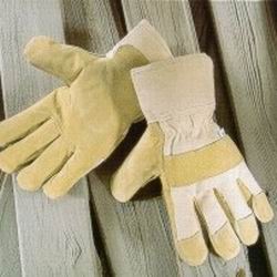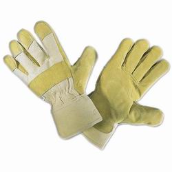Arbeitshandschuhe aus Schweinsspaltleder in gelb mit weißem Rücken und Stulpe.