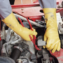 Schutzhandschuh. Mit Hilfe des Spezial-Nitrils erfüllt er alle besonderen Anforderungen an einen