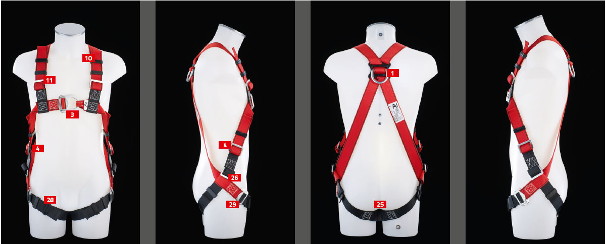 | | 29 | Verstellung/Verschluss: Beingurte mit Durchsteckrahmen |