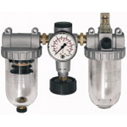 Wartungseinheit 3-tlg. »Standard« mit Polycarbonatbehälter, BG 3, G 3/4, Eingangsdruck max. 16 bar, Regelbereich 0,5 - 10 bar. Dreiteilige Wartungseinheiten, bestehend aus einem vordruckunabhängigen, rücksteuerbaren Membrandruckregler mit Sekundärentlüftung, einem Zentrifugalabscheider und einem Proportionalöler.