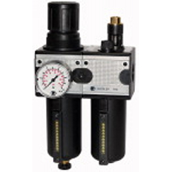 Wartungseinheit 2-tlg. »multifix«, Metallbehälter und Sichtrohr, BG 1, G 1/4, Eingangsdruck max. 20 bar, Regelbereich 0,5 - 10 bar. Zweiteilige Wartungseinheiten, bestehend aus einem vordruckunabhängigen, rücksteuerbaren Membrandruckregler mit Sekundärentlüftung in Verbindung mit einem Zentrifugalabscheider und einem Proportionalöler.