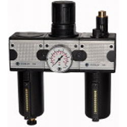 Wartungseinheit 3-tlg. »multifix«, Metallbehälter und Sichtrohr, BG 3, G 3/4, Eingangsdruck max. 20 bar, Regelbereich 0,5 - 10 bar. Dreiteilige Wartungseinheiten, bestehend aus einem vordruckunabhängigen, rücksteuerbaren Membrandruckregler mit Sekundärentlüftung, einem Zentrifugalabscheider und einem Proportionalöler.