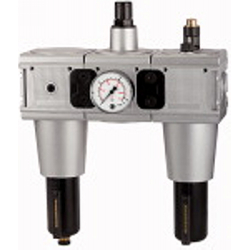 Wartungseinheit 3-tlg. »multifix«, Metallbehälter und Sichtrohr, BG 5, G 1, Eingangsdruck max. 20 bar, Regelbereich 0,5 - 10 bar. Dreiteilige Wartungseinheiten, bestehend aus einem vordruckunabhängigen, rücksteuerbaren Membrandruckregler mit Sekundärentlüftung, einem Zentrifugalabscheider und einem Proportionalöler.
