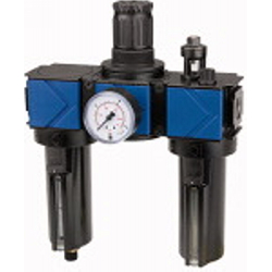 Wartungseinheit 3-tlg. »variobloc« mit Metallbehälter inkl. Sichtrohr und Tropfaufsatz Metall, BG 2, G 3/4, PE max. 20 bar. Dreiteilige Wartungseinheiten bestehend aus einem vordruckunabhängigen, rücksteuerbaren Membrandruckregler mit Sekundärentlüftung in Verbindung mit einem Zentrifugalabscheider und einem Proportionalöler. Bewährte Serie in modernem Industriedesign, die sich durch einfaches Handling, bequeme Verblockungsmöglichkeit durch neuartige Verbindungsmodule und hervorragende Durchflusswerte auszeichnet.