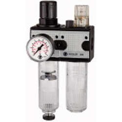 Wartungseinheit 2-tlg. »multifix« mit Polycarbonatbehälter, BG 1, G 3/8, Eingangsdruck max. 16 bar, Regelbereich 0,5 - 10 bar. Zweiteilige Wartungseinheiten, bestehend aus einem vordruckunabhängigen, rücksteuerbaren Membrandruckregler mit Sekundärentlüftung in Verbindung mit einem Zentrifugalabscheider und einem Proportionalöler.