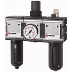 Wartungseinheit 3-tlg. »multifix«, PC-Behälter und Schutzkorb, BG 4, G 1, Eingangsdruck max. 16 bar, Regelbereich 0,5 - 10 bar. Dreiteilige Wartungseinheiten, bestehend aus einem vordruckunabhängigen, rücksteuerbaren Membrandruckregler mit Sekundärentlüftung, einem Zentrifugalabscheider und einem Proportionalöler.