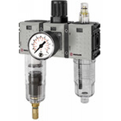 Wartungseinheit 3-tlg. »FUTURA-mini«, PC-Behälter, Standardmano, BG 0, G 1/4, PE 1,5 - 12 bar, Regelbereich 0,5-8 bar, Ablass: VA. Dreiteilige Wartungseinheiten in modernem Design und mit hervorragenden Durchflusswerten. Arretierbarer Membrandruckregler mit Sekundärentlüftung.