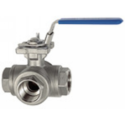 3-Wege-Kugelhahn, L-Bohrung, Edelstahl 1.4408, G 1/2, DN 12,7, Betriebstemperatur -20 °C bis 180 °C, PN max. 63 bar. Wahlweise mit L- oder T-Bohrung, reduzierter Durchgang. Allseitig dichtende Ausführung mit integrierter ISO-Flanschplatte (ISO 5211). Mehrere Schaltvarianten durch 360° Hebeldrehung.
