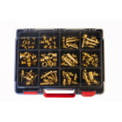 Bestückung: 38 Einschraubschlauchtüllen G 1/4-6 • G 1/4-9 • G 3/8-9 • G 1/2-9 • G 1/2-13 32 Doppelnippel G 1/4 x G 1/4 • G 3/8 x G 3/8 • G 1/2 x G 1/2 50 Reduziernippel G 1/4 a. x G 1/8 i. • G 3/8 a. x G 1/4 i. • G 1/2 a. x G 3/8 i. • G 1/2 a. x G 1/4 i.