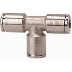 T-Steckverbindung »metallica«, für Schlauch-Außen-Ø 8 mm, Arbeitsdruck max. 16 bar, Betriebstemp. -20 °C bis 150 °C, MS vern.. Schnellsteckverbindungen komplett aus Messing vernickelt. Die Teile mit zylindrischem Gewinde sind mit einem FKM-O-Ring ausgestattet. Die konischen Gewinde sind mit der Dispersion preCOTE 5 beschichtet, so dass alle Verbindungen dieser Serie auch bei hohen Temperaturen eingesetzt werden können (Medium Druckluft).