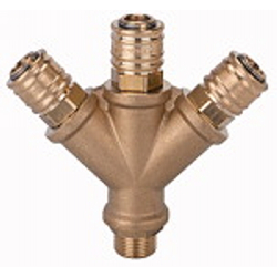 Verteiler mit 3 Schnellverschlusskupplungen NW 7,2, Messing blank, G 3/8 AG, Betriebsdruck 0 - 35 bar, Temp. -20 °C bis 100 °C. 1-, 2- bzw. 3-fach-Verteilerstücke aus Messing blank, fertig konfektioniert mit Schnellverschlusskupplung NW 7,2. Wahlweise mit Anschlussgewinde innen oder außen bzw. Stecknippel zum Adaptieren in eine bestehende Schnellverschlusskupplung NW 7,2 bis NW 7,8.