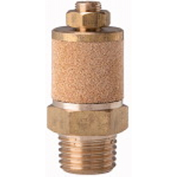 Schalldämpfer, Sinterbronce/Messing, Abluft einstellbar, R 1, SW 36 mm,Betriebsdr. max. 10 bar, Betriebstemp. -10 °C bis 250 °C. Über eine Justierschraube kann das Abluftvolumen eingestellt werden, Fixierung durch Kontermutter.