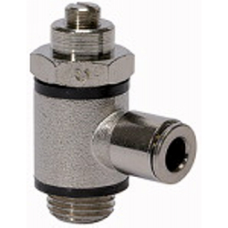 Dros.rücks.ventil, Schlitzschr., Abluftdros. (»C«) Steckverb. Schlauch 10, G 1/4, PN max. 10 bar, Temp. 0 °C bis 70 °C, MS vern.. Zur feinen Regulierung der Kolbengeschwindigkeit von Zylindern und Durchflussmengen. Ausführung in Hohlschraubenbauweise mit Ringstück. Zum direkten Einschrauben am Ventil oder Zylinder. Kleine Baumaße, ideal bei engen Platzverhältnissen.