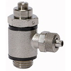 Dros.rücks.ventil, Schlitzschr., Abluftdros. (»C«) Schnellverschr. Schlauch 6/4, G 1/4, PN max. 10 bar, Temp. 0°C bis 70°C, MS v.. Zur feinen Regulierung der Kolbengeschwindigkeit von Zylindern und Durchflussmengen. Ausführung in Hohlschraubenbauweise mit Ringstück. Zum direkten Einschrauben am Ventil oder Zylinder. Kleine Baumaße, ideal bei engen Platzverhältnissen.