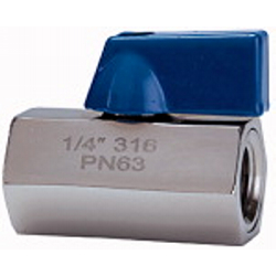 Mini-Kugelhahn, Edelstahl 1.4401, IG/IG, Betriebstemperatur -20 °C bis 120 °C, G 1/2, DN 9,2, PN max. 63 bar.