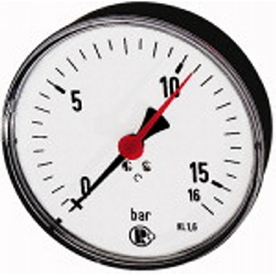 Standardmano., Kunststoffgeh., Einfachskala in bar, Anschluss hinten zentrisch, G 1/4, Güteklasse 2,5, Messber. 0 - 1,6 bar, Ø 80. Rohrfedermanometer in Standardausführung.