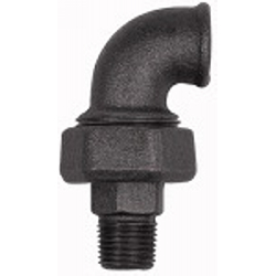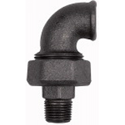 Verschraubung Bogen 97, flach dichtend, Rp 1 1/4, R 1 1/4, Temperguss schwarz, Betriebstemp. -20 °C bis 200 °C, ISO 7-1. Maximale Temperatur und maximaler Betriebsdruck dürfen nicht gleichzeitig auftreten!