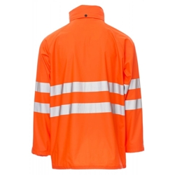 Normen und Einstufung - EN ISO 20471 - Klasse 3 - EN343:2019 31X Eigenschaften und Vorteile - Regenjacke für hohe Sichtbarkeit mit 3M-Streifen - Hoher Kragen, im Kragen einrollbare Kapuze mit Kordelzug - Raglanärmel, gerader Ärmelabschluss mit elastischem Innenbündchen - Verdeckter Nylonreißverschluss mit sichtbaren Druckknöpfen - 2 seitlich aufgesetzte Taschen mit Patte und sichtbaren Druckknöpfen - Kordelzug unten - Warmversiegelte Streifen und Nähte - Ganz aus fluoreszierendem Stoff mit zwei Reflexstreifen rund um Brust und Ärmel
