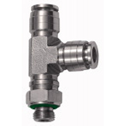 T-Steckverschraubung, drehbar, L-Form, G 1/4 a., für Schlauch-Außen-Ø 4 mm, Arbeitsdruck max. 20 bar, Edelstahl 1.4404. Für den Einsatz in aggressiven Umgebungen und bei korrosiven Medien, welche sowohl in der Chemie- und Lebensmittelindustrie als auch im Bereich Verpackung, Druckerei und Seefahrt zum Einsatz kommen.
