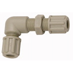 Winkel-Schottverbindung, M10x1,0, für Schlauch 4/6 mm, SW 14, Arbeitsdruck max. 10 bar (20 °C) / max. 2,5 bar (90 °C), PP. Chemisch beständig gegenüber fast allen anorganischen Säuren und Basen, auch bei hoher Konzentration und Temperaturen bis 90 °C.