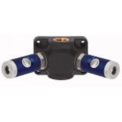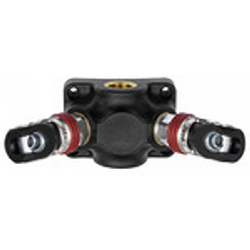 Endverteilerdose Kunststoff, 2 Sicherheitskupplungen NW 7,4, Eingangsgew. G 1/2, Betriebsdruck max. 12 bar, Temp. -10 °C bis 50 °C. 2- bzw. 3-fach-Verteilerdosen aus hochfestem, glasfaserverstärkten Kunststoff (PA6 GF 30) mit großer Anwendungsvielfalt. Wahlweise mit 2 oder 3 fertig konfektionierten Druckknopf-Sicherheitskupplungen sowie 2 Gewindegrößen für das Eingangsgewinde. Alle Verteilerdosen haben einen robusten Messing-Gewindeeinsatz für hohe Anzugsdrehmomente und sind TÜV-zertifiziert.