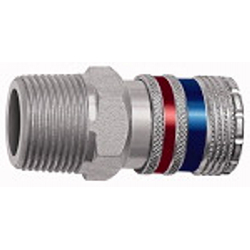 Sicherheitskupplung NW 10, Stahl/Messing verz., R 3/8 AG, Betriebsdruck max. 16 bar, Mediums-/Umgebungstemp. -20 °C bis 100 °C. Hochwertige, robuste und langlebige, mit einer Hand bedienbare Schnellverschlusskupplung in Sicherheitsausführung mit sehr hoher Durchflussleistung bei geringem Druckabfall. Die Entriegelung erfolgt vollautomatisch in zwei Stufen. Die Kupplung wird vor dem endgültigen Entkuppeln entlüftet. Dabei wird der Kupplungsstecker erst freigegeben, wenn der Restdruck von ca. 0,3 bar unterschritten wurde. Somit wird der berüchtigte Peitschenhiebeffekt verhindert und das Risiko der Verletzung des Bedienpersonals praktisch ausgeschlossen.