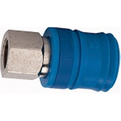 Sicherheitskupplung NW 7,4, Typ KE, Messing vern., G 3/8 IG, Betriebsdruck max. 12 bar, Mediums-/Umgebungstemp. -20°C bis 60°C. Einhand-Sicherheitskupplungen mit zweifacher Verriegelung. Das Kuppeln erfolgt wie bei Standardkupplungen durch einfaches Eindrücken des Steckers in die Kupplung. Beim Entkuppeln wird die erste Verriegelung durch Zurückschieben der Verriegelungshülse freigegeben. Das Kupplungsventil schließt. Jetzt kann die komprimierte Luft aus dem Stecker und im Schlauch entweichen. Durch nochmalige Betätigung der Entriegelungshülse wird das zweite Verriegelungssystem freigegeben. Erst jetzt kann die Verbindung sicher gelöst werden.