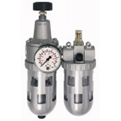 Wartungseinheit 2-tlg. »Standard«, PC-Behälter und Schutzkorb, BG 1, G 1/4, Eingangsdruck max. 16 bar, Regelbereich 0,5 - 10 bar. Zweiteilige Wartungseinheiten, bestehend aus einem vordruckunabhängigen, rücksteuerbaren Membrandruckregler mit Sekundärentlüftung in Verbindung mit einem Zentrifugalabscheider und einem Proportionalöler.
