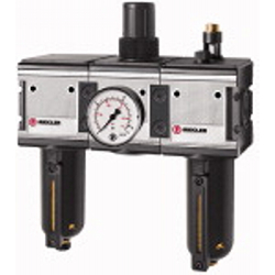Wartungseinheit 3-tlg. »multifix«, Metallbehälter und Sichtrohr, BG 1, G 1/4, Eingangsdruck max. 20 bar, Regelbereich 0,5 - 10 bar. Dreiteilige Wartungseinheiten, bestehend aus einem vordruckunabhängigen, rücksteuerbaren Membrandruckregler mit Sekundärentlüftung, einem Zentrifugalabscheider und einem Proportionalöler.