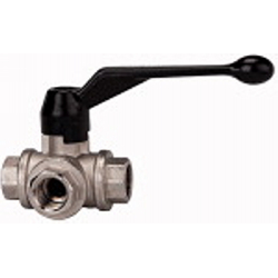 3-Wege-Kugelhahn, T-Bohrung, leichte Ausführung, MS vern., Mediums-/ Umgebungstemp. -15°C bis 100°C, Rp 3/4, DN 20, PN max. 40 bar. Allseitig abdichtende Ausführung mit T-Bohrung.