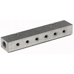 Verteilerleiste, Abgänge einseitig vorne, Eingang 2 x 3/8, Ausgang 6 x 1/8, Aluminium. Zur einfachen Montage von Druckluft-Entnahmestellen (Verschraubungen, Steckverbinder, Kupplungen etc.). Wahlweise mit 2, 3, 4 oder 6 Abgängen, einseitig oder beidseitig.