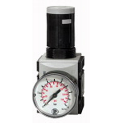 Präzisionsdruckregler »FUTURA«, inkl. Manometer, BG 2, G 3/8, PE max. 16 bar, Temp. -10 °C bis 50 °C, Regelbereich 0,5 - 10 bar. Präzisions-Membrandruckregler mit Sekundärentlüftung in modernem Design und mit hervorragenden Durchflusswerten zur Erreichung eines äußerst präzisen Arbeitsdrucks. Arretierbarer und abschließbarer Regelknopf.