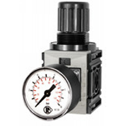 Druckregler, durchg. Druckversorgung »FUTURA-mini«, Standardmano., BG 0, G 1/4, PE max. 12 bar, Regelbereich 0,5 - 8 bar. Anreihbare Membrandruckregler mit Sekundärentlüftung in modernem Design und mit hervorragenden Durchflusswerten. Durch Verblockung von mindestens zwei oder mehreren Reglern können über eine Zuluftzuführung mehrere Arbeitsluftkreise mit verschiedenen Ausgangsdrücken versorgt werden. Arretierbarer Regelknopf.