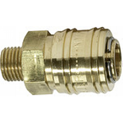 Schnellverschlusskupplung NW 7,2 »connect line«, MS blank, G 3/8 AG, Betriebsdr. 0 - 35 bar, Mediums-/Umgeb.temp. -20°C bis 100°C. Die universelle Einhand-Schnellverschlusskupplung in einseitig absperrender Ausführung zu einem enorm günstigen Preis. Durch die geschlossene Verriegelungshülse wird ein Verschmutzen der Innenteile verhindert. Bei Verwendung von Stahlnippeln kann diese Kupplung aufgrund ihrer gehärteten Verriegelungsstifte auch an Druckluftwerkzeugen verwendet werden. Kupplungen und Nippel mit dichtender Gewindebeschichtung: Montagefertige Polyacrylat-Gewindebeschichtung für sofortige und hohe Dichtheit ohne Aushärtungsprozess. Das dauerelastische Dichtmaterial kann bis zu 45° nachjustiert werden, ohne die Dichtheit zu beeinflussen. Gesundheitlich unbedenklich. Leichte Montage und Demontage. Um Verletzungen oder den Peitschenhiebeffekt zu vermeiden, empfehlen wir den Stecknippel beim Entkuppeln mit einer Hand festzuhalten.