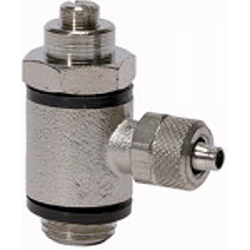 Dros.rücks.ventil, Schlitzschr., Zuluftdros. (»V«) Schnellverschr. Schlauch 5/3, M5, PN max. 10 bar, Temp. 0°C bis 70°C, MS vern.. Zur feinen Regulierung der Kolbengeschwindigkeit im Vor- und Rücklauf von Zylindern und von Durchflussmengen. Ausführung in Hohlschraubenbauweise mit Ringstück. Zum direkten Einschrauben am Ventil oder Zylinder. Kleine Baumaße, ideal bei engen Platzverhältnissen.