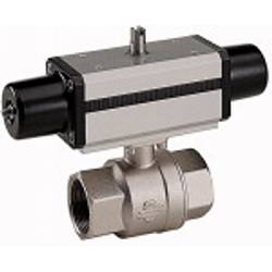 2-Wege-Messingkugelhahn, pneumat. Stellantrieb federschließend, MS vern., Betriebstemp. max. 70 °C, Rp 3, DN 80, PN max. 16 bar. 2-Wege-Hahn, voller Durchgang. Pneumatischer Schwenkantrieb in doppelt- oder einfachwirkender Ausführung und integriertem Stellungsanzeiger.