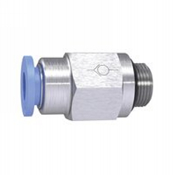 Ger. Rückschlagventil »Blaue Serie«, Schl. zu Gew., R 1/8 a., für Schl.-Außen-Ø 8 mm, Arbeitsdr. max. 10 bar, Kunststoff/MS vern.. Die Rückschlagfunktion dieser Schnellsteckverbindungen verhindert den Rückfluss des Luftstroms und lässt auf Grund der unidirektionalen Bauweise die Strömung der Luft nur in eine Richtung zu. Die Teile sind lieferbar in Ausführung: Durchfluss vom Gewinde zum Schlauch bzw. vom Schlauch zum Gewinde.