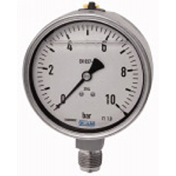 Glyzerinmanometer, CrNi-Stahl, Einfachskala in bar, Anschluss radial unten, G 1/4, Güteklasse 1,6, Messber. -1 / +0,6 bar, Ø 63. Rohrfedermanometer mit Glyzerinfüllung in CrNi-Stahl-Ausführung.