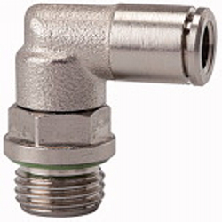 L-Steckverschraubung »metallica«, drehbar, R 1/8 a., für Schlauch-Außen-Ø 6 mm, Arbeitsdruck max. 16 bar, Messing vernickelt. Schnellsteckverbindungen komplett aus Messing vernickelt. Die Teile mit zylindrischem Gewinde sind mit einem FKM-O-Ring ausgestattet. Die konischen Gewinde sind mit der Dispersion preCOTE 5 beschichtet, so dass alle Verbindungen dieser Serie auch bei hohen Temperaturen eingesetzt werden können (Medium Druckluft).